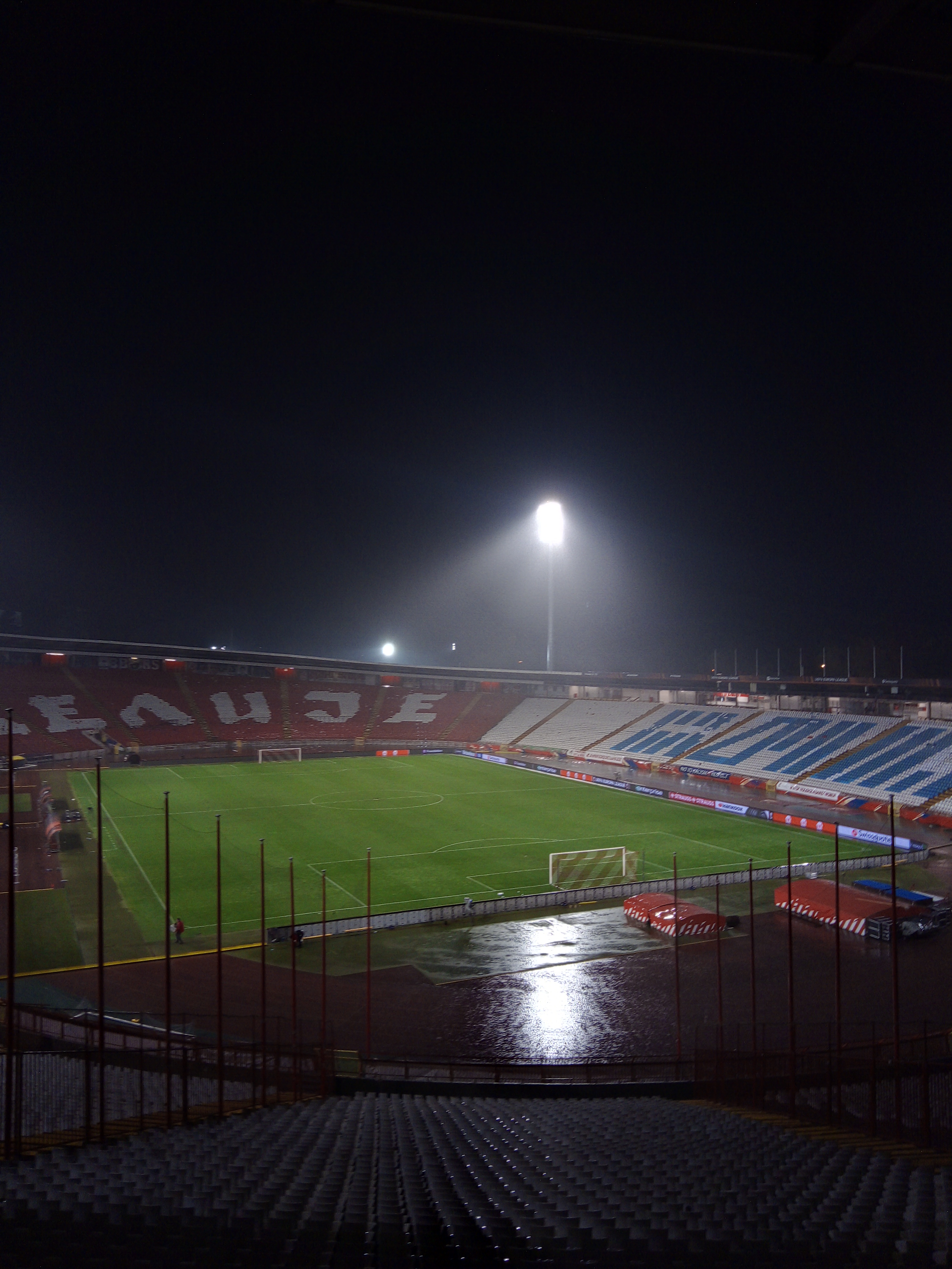 Stadion Rajko Mitic er et legendarisk stadion som taler for sig selv. Det var fedt at ankomme til stadion i taxa og se hele området badet i lys fra lysmasterne. Der var udkommanderet meget politi til at passe på os. Jeg talte 3 x 8 stk kampklædte urobetjente samt 5-6 civilbetjente plus diverse stewards. Det må siges at de serbiske myndigheder tog situationen seriøst. Der blev ikke taget nogle chancer. Dette også gældende ved visitationen inden adgang til stadion. Jeg er blevet visiteret tidligere, men nok ikke så seriøst som i Serbien. Jeg måtte lige tælle til ti da jeg fik tjekket mine testikler meget nøjagtigt.